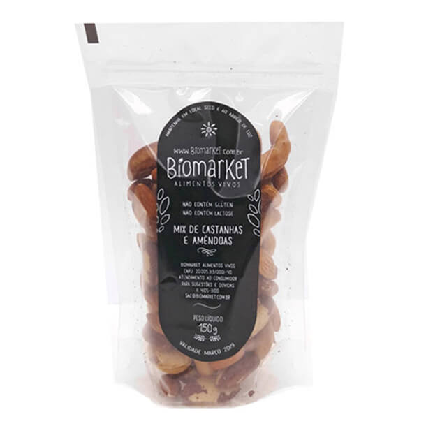 Mix lanche feliz com amêndoas cruas, castanhas de Caju levemente salgadas e castanhas do Brasil.